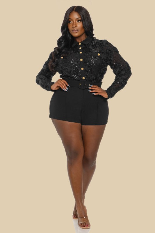 A sultry statement piece made for celebrations, brunches, and night-out glam. The Floral Luxe Romper blends 3D florals, sequin lace, and a curve-accentuating belted waist for a look that’s bold, feminine, and impossible to ignore.