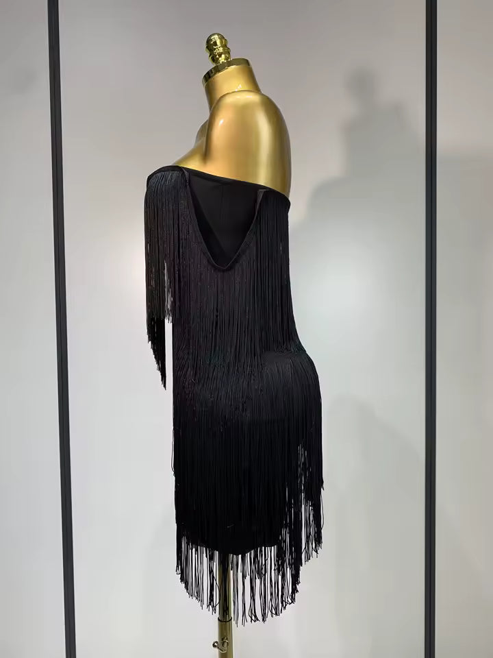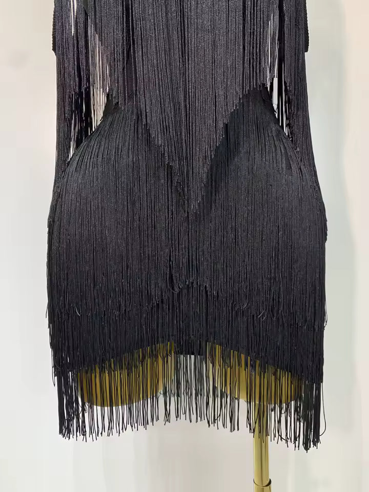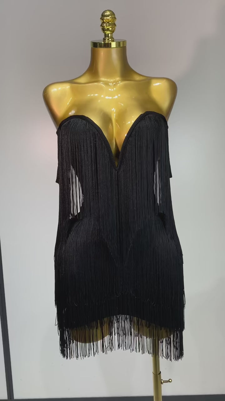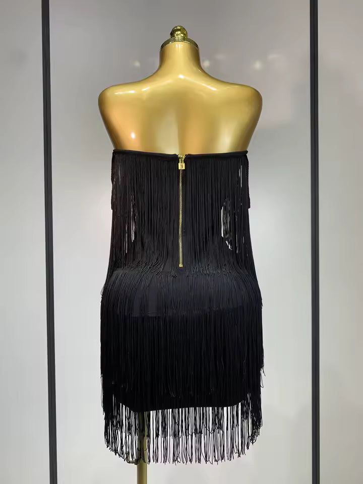 A sultry strapless bandage mini that hugs every curve, finished with off-shoulder tassels for a glamorous, red-carpet vibe.