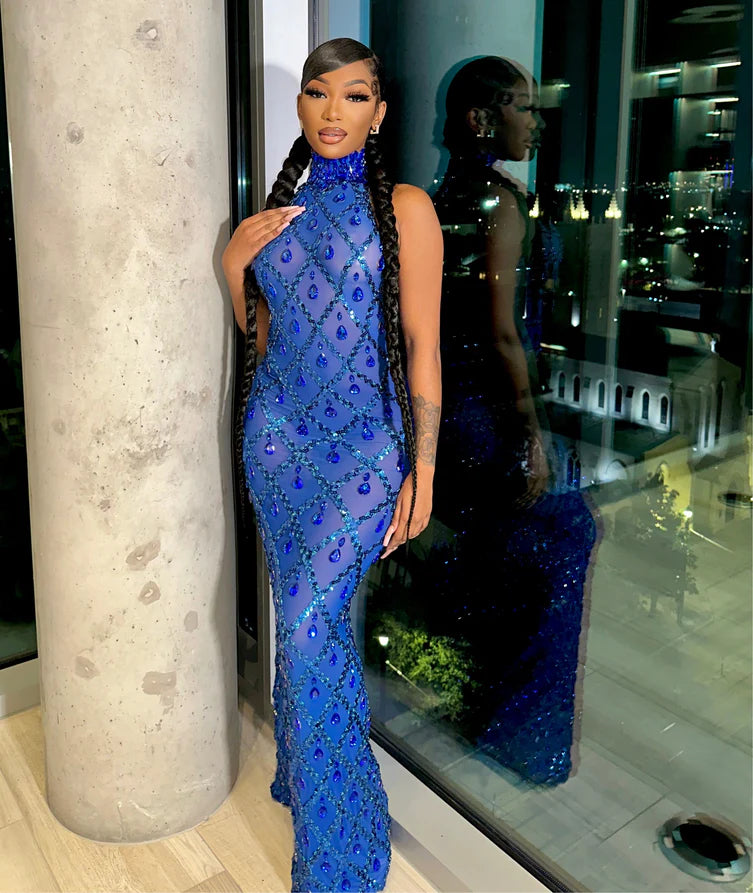 The Radiant Teardrop Maxi Dress is the pinnacle of luxury and style. Adorned with dazzling diamond-shaped embellishments arranged symmetrically, this maxi dress features a high neckline for an elegant finish, paired with a nude mesh insert that adds a touch of allure. This showstopper exudes glamour and is guaranteed to place you on the best-dressed list at any event.