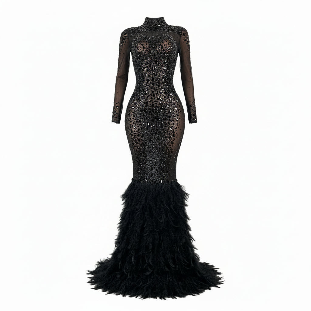 A black crystal-embellished feather gown designed for bold, high-fashion glamour.