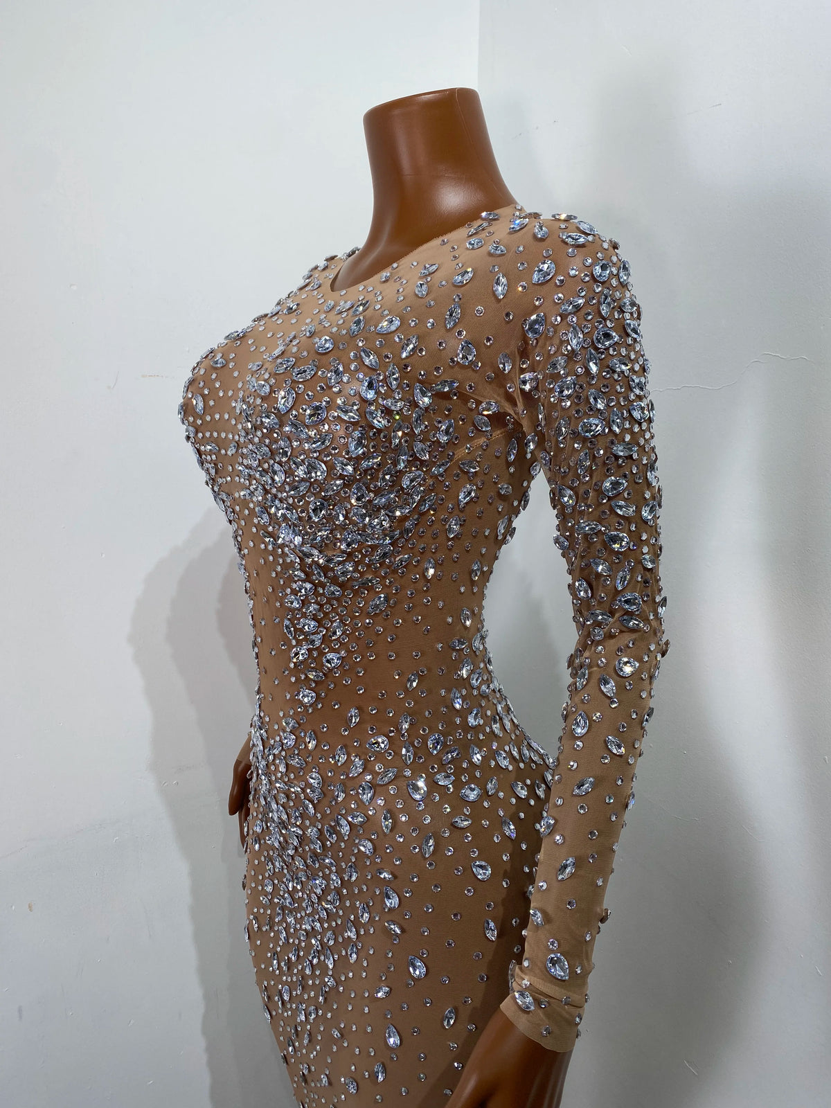 Softly luminous and full of sparkle, this beige long-sleeve maxi is showered in diamonds for a look that’s both elegant and unforgettable. Perfect for birthdays, luxury evenings, and stage-ready moments.