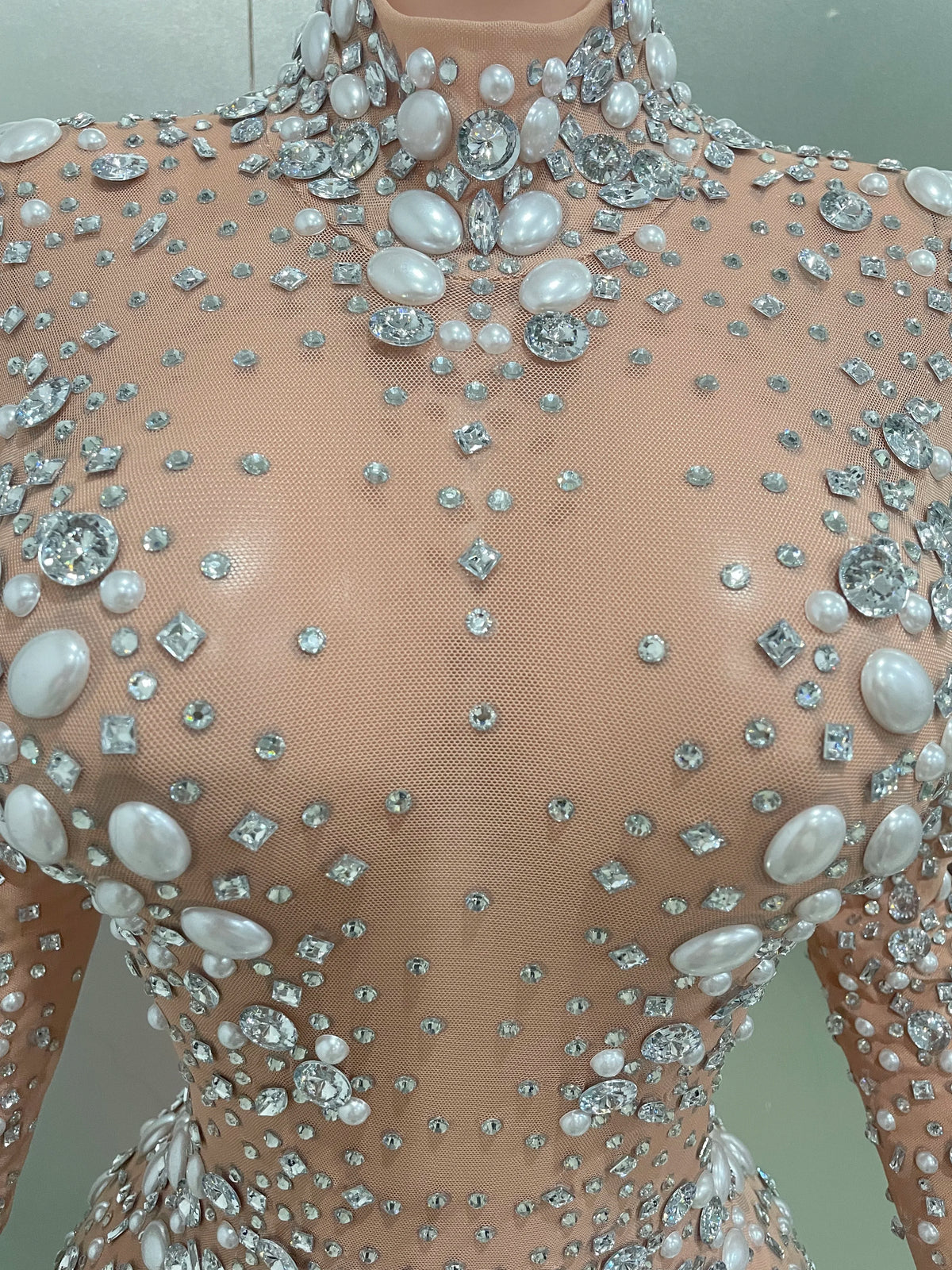 Long-sleeve mesh design with full rhinestone and pearl beading