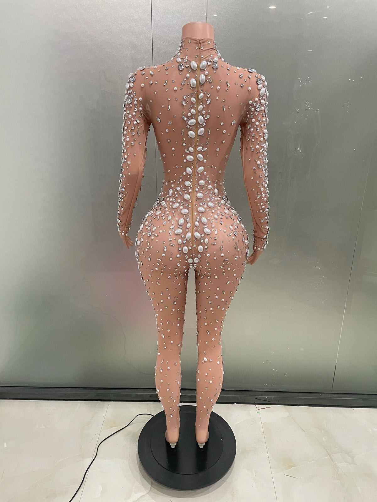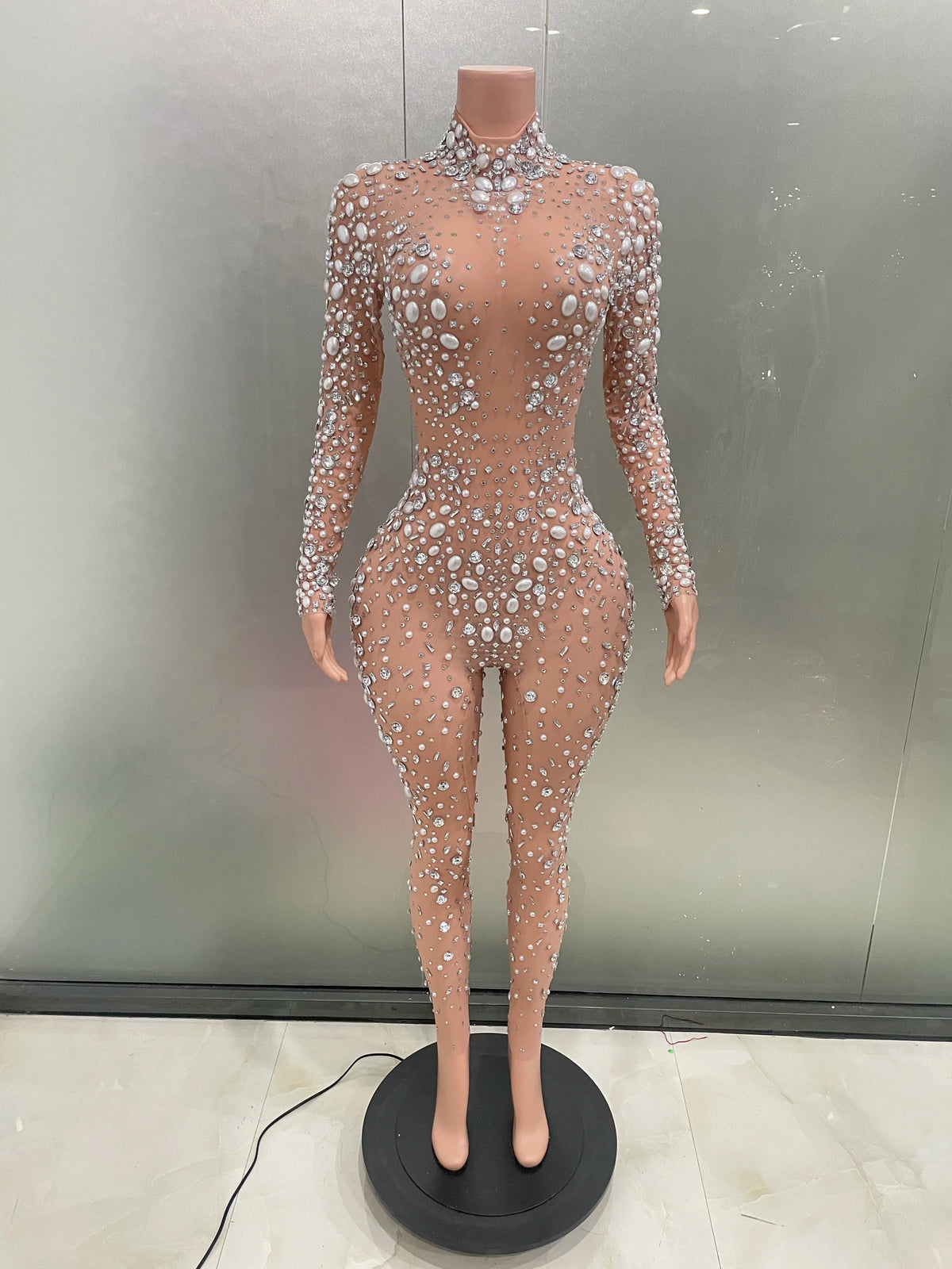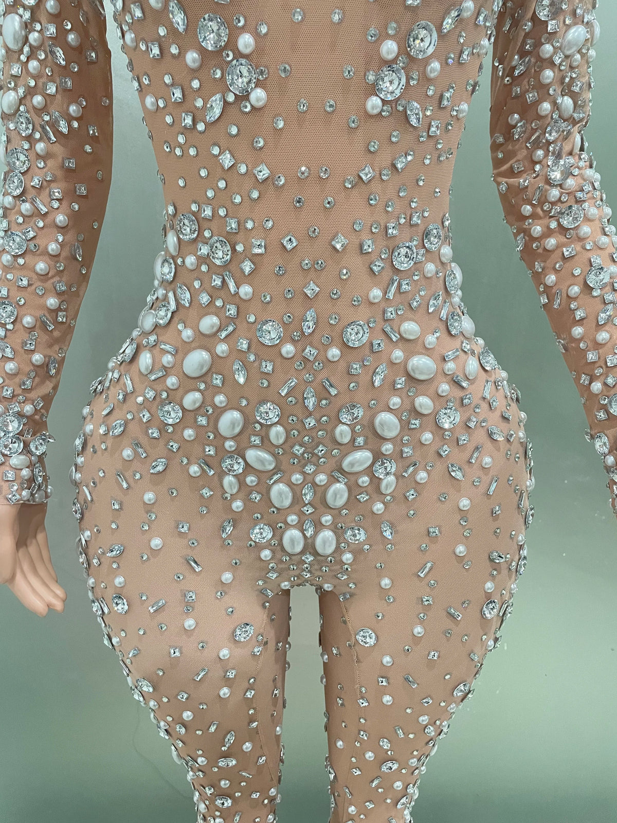 Crafted from sheer mesh and hand-embellished with sparkling rhinestones and luminous pearls, this jumpsuit blends sensual transparency with luxury detailing. Designed for performers, party queens, and women who live to shine.