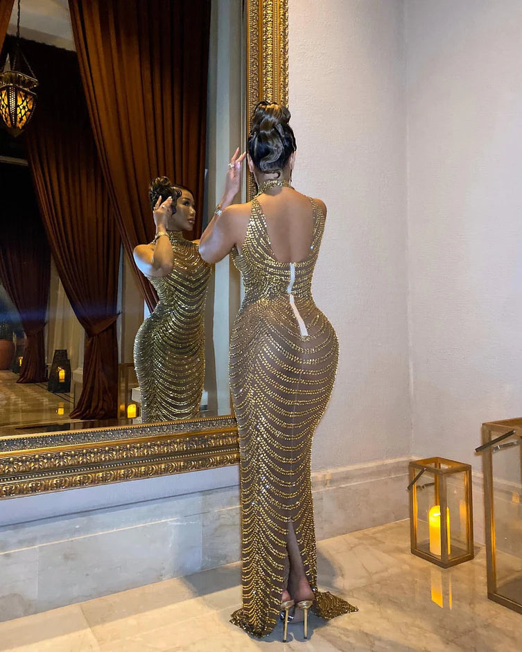 Sparkly Gold Rhinestone Off-Shoulder Gown