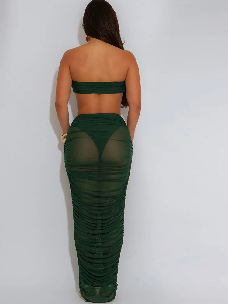 This pleated, see-through tube top and ruched maxi skirt set brings effortless glam to your next beach event or holiday soirée.
