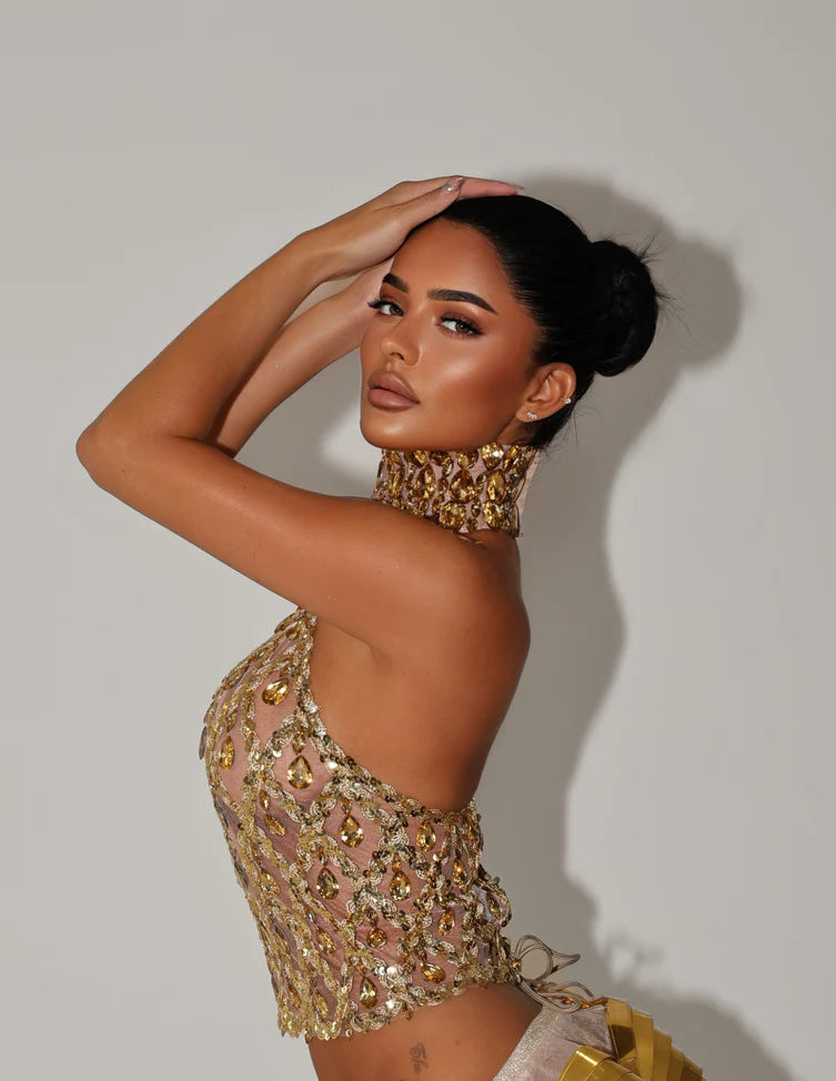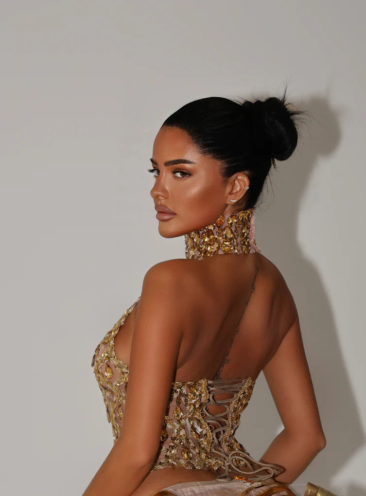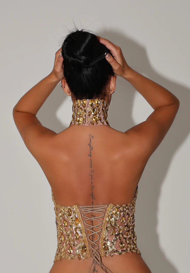 Own every room in this high-impact corset, dripping in hand-set golden crystals and unapologetic attitude.