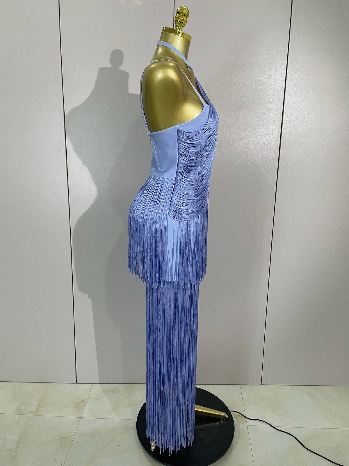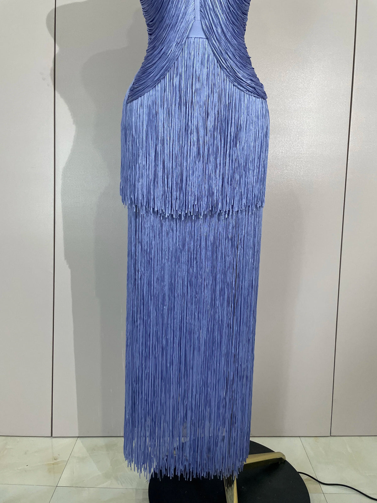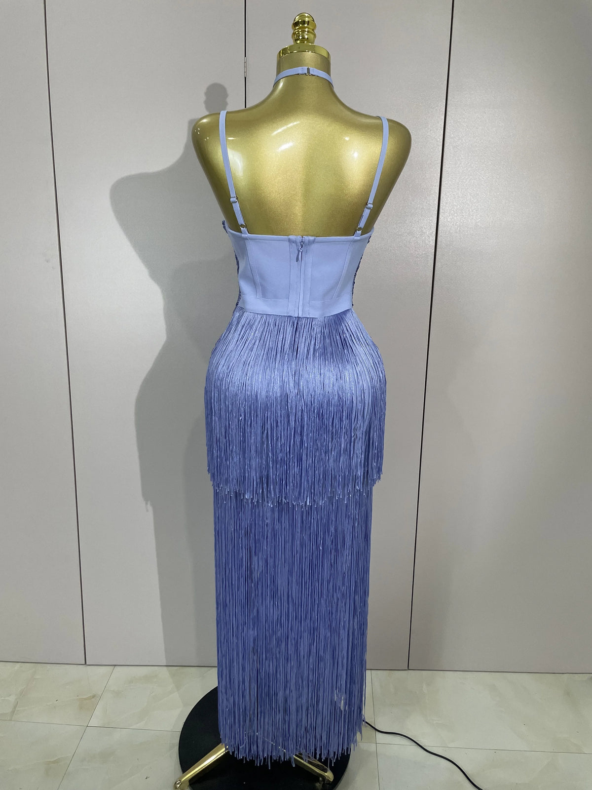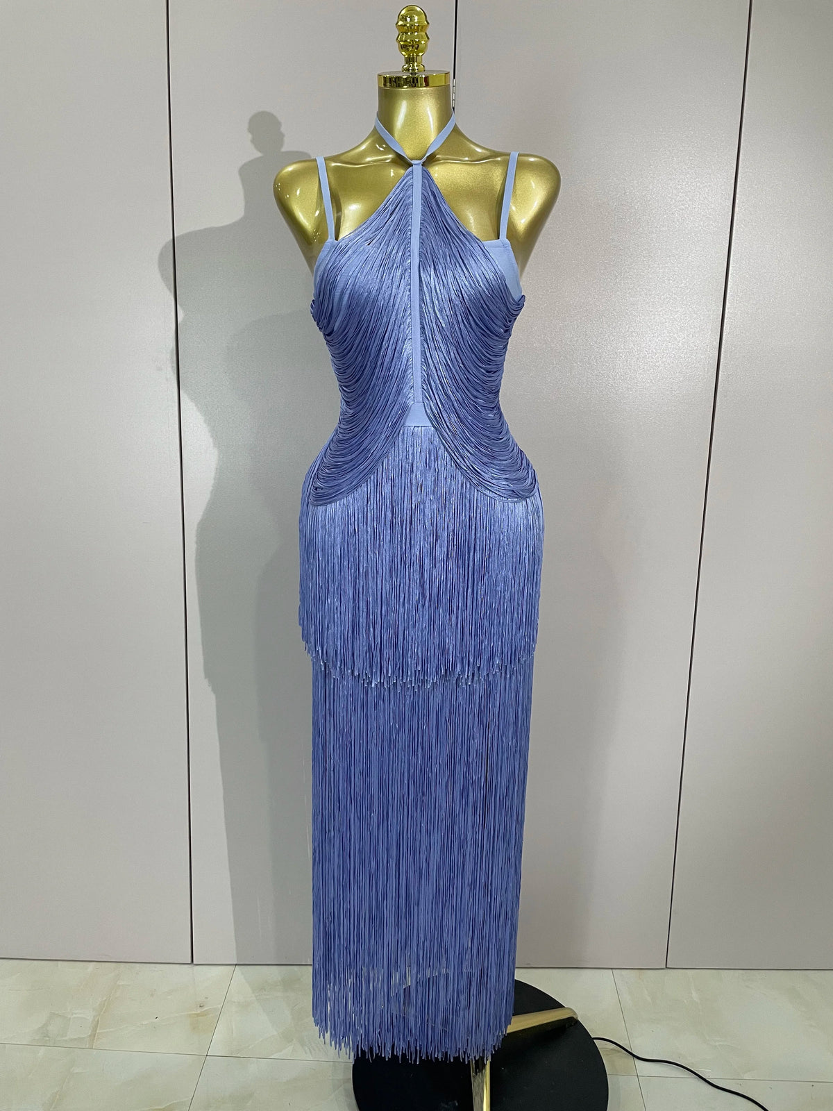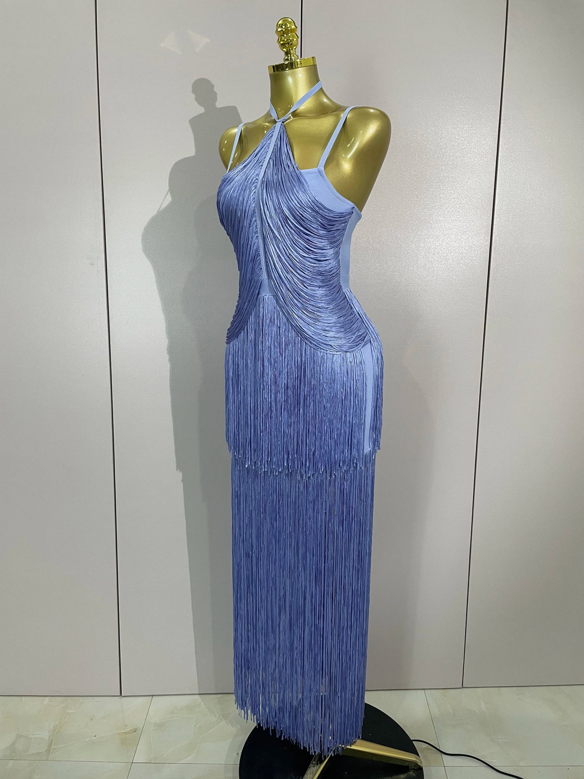Make every step a statement in the Golden Motion Tassel Dress a show-stopping design made to move with you. With its shimmering rhinestone details, elegant backless cut, and ankle-grazing tassels, this dress delivers the perfect mix of sultry movement and red-carpet sophistication.