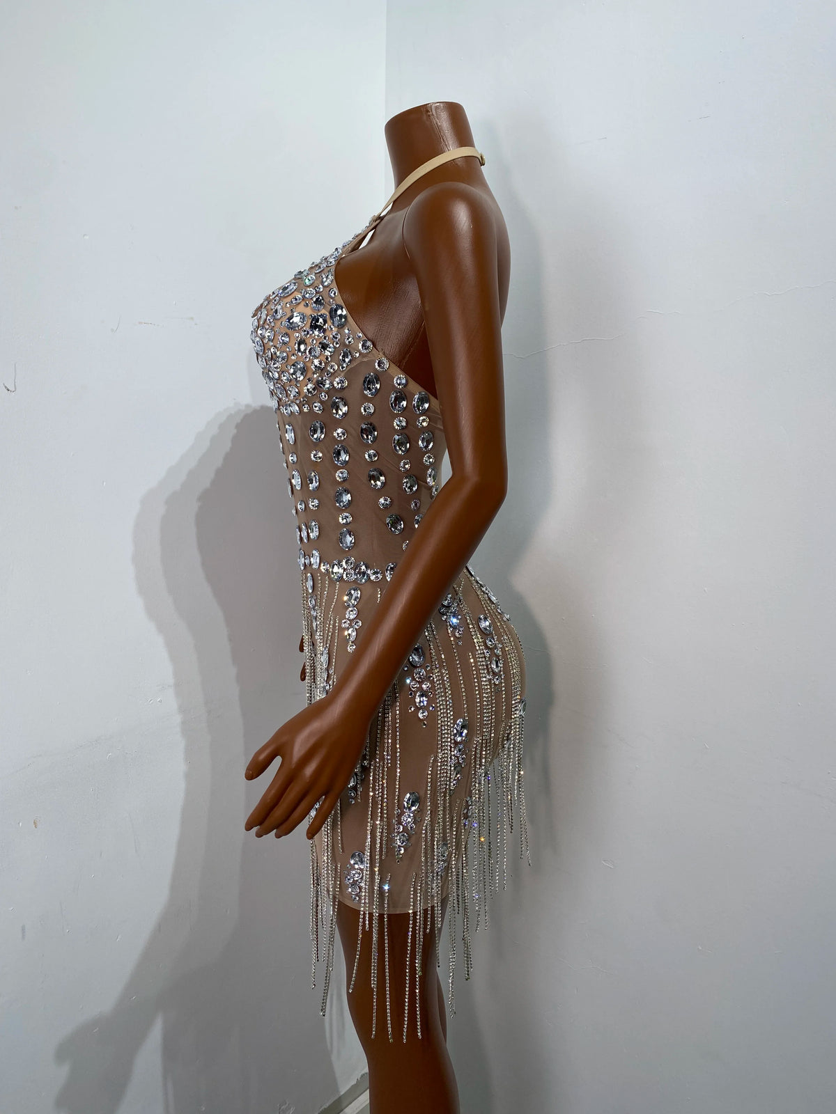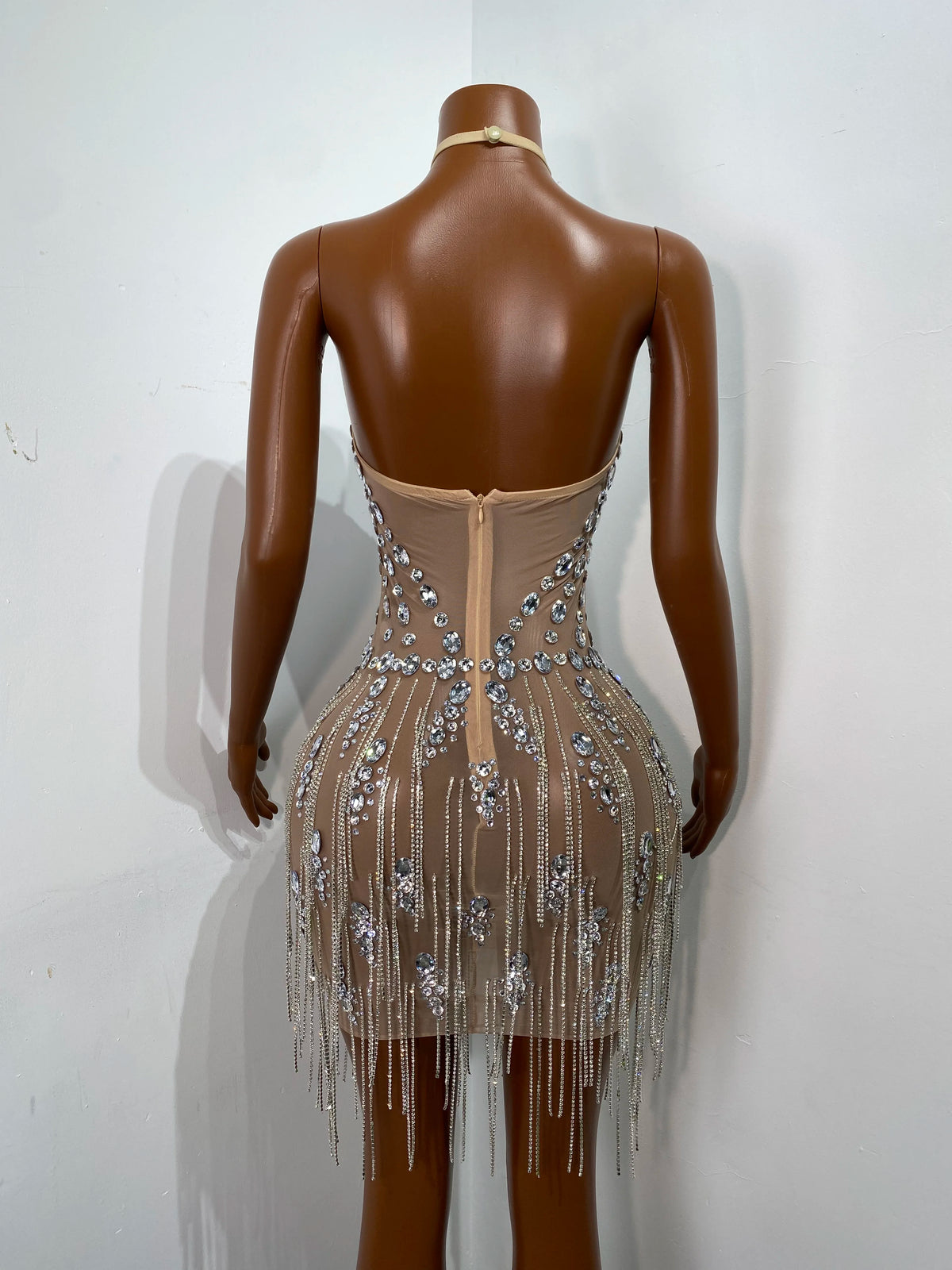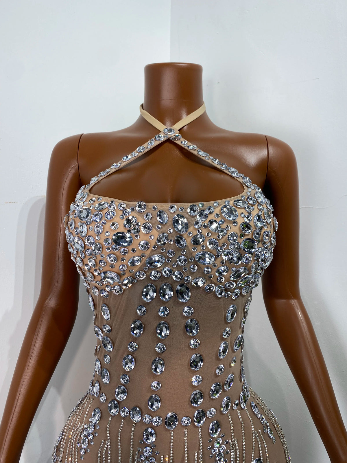 crystal halter mini dress, diamond bodycon party dress, sparkly birthday outfit, nightclub stage performance clothing, luxury women’s fashion